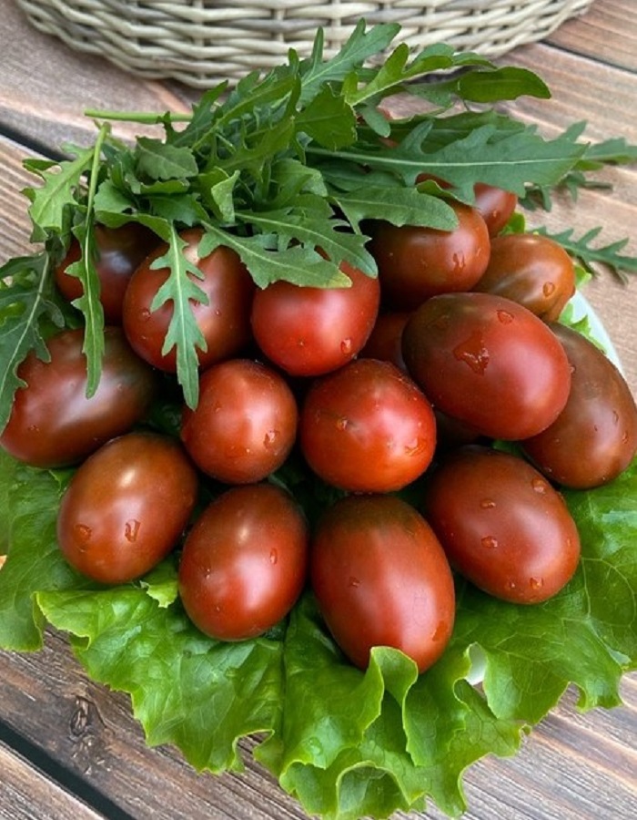 Очень урожайный индетерминантный сорт для закрытого грунта. Плоды оригинальной яйцевидной формы, цвета темной вишни, массой 50-70 гр, очень сладкие. Ценность сорта: высокая урожайность, уникальная окраска плодов, пригодность для цельноплодного консервирования, слабая восприимчивость к фитофторозу. Рекомендуется для употребления в свежем виде и цельноплодного консервирования.
