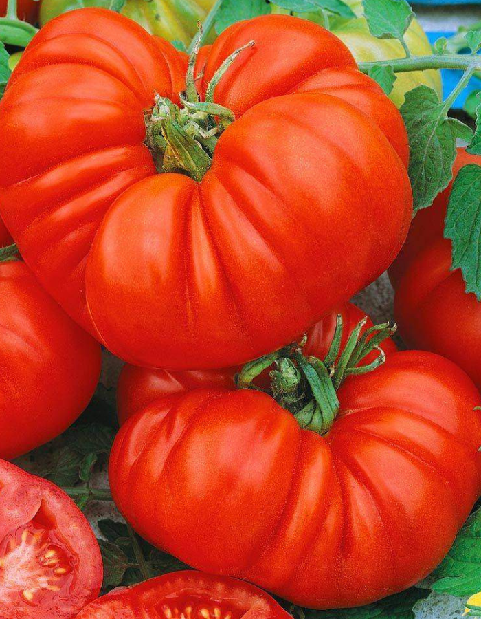 Среднеранний сорт с гигантскими плодами диаметром до 20 см и весом до 2 кг! Предназначен для выращивания в стеклянных или плёночных теплицах. Требует формирования и обязательной подвязки. Растение сильнорослое, индетерминантного типа. Соцветие простое с 3-4 плодами. Для получения максимального размера и веса плодов необходимо оставлять в кисти не более двух завязей. Плоды плоско-округлой формы, сильно ребристые, многокамерные, мясистые, насыщенного красного цвета и изумительных вкусовых качеств. На первом и втором соцветиях плоды могут быть бессемянными. Благодаря отменному вкусу и повышенной сахаристости Брутус – лучший сорт для приготовления салатов и томатного сока. При соблюдении рекомендаций по агротехники с каждого растения можно получить до 10 кг плодов. Формируют растение в один стебель с обязательной подвязкой и самого растения и кистей с созревшими плодами к шпалере или опоре. Необходимо проводить своевременное пасынкование и подкормки растения минеральными удобрениями, особенно в период формирования плодов.