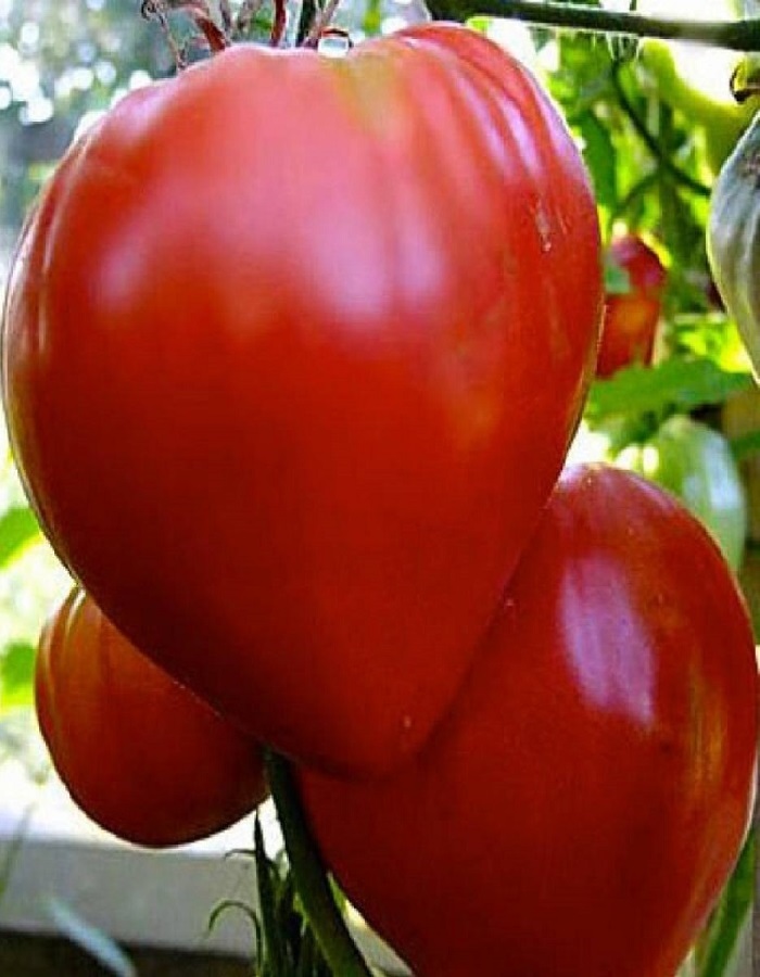 Среднеспелый сорт-гигант для защищённого грунта. Прекрасно подходит для садоводов, предпочитающих крупноплодные томаты, которые выращивают в закрытом грунте. Растение индетерминантное, мощное, высотой 1,5-2 м, что позволяет полностью использовать весь объём теплицы. Плоды любимой всеми сердцевидной формы, красные, мясистые, великолепного вкуса. Впечатляет размер томатов — от 400-600 г до 1,5 кг, причем, чем лучше уход за растением, тем крупнее плоды и обильнее урожай.