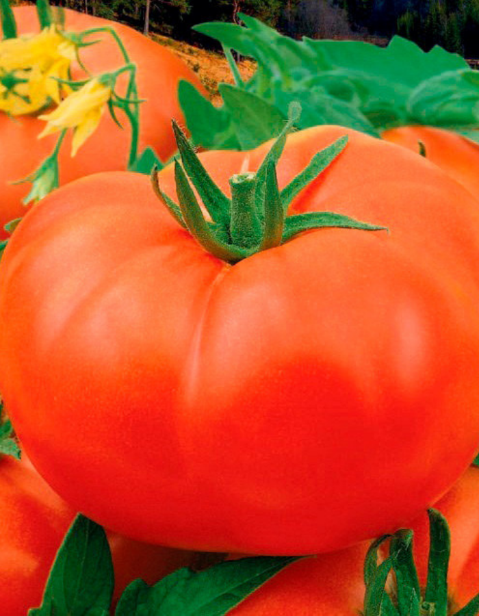 Невероятно урожайный, раннеспелый сорт для выращивания в теплицах и парниках. Плоды плоскоокруглые, тяжеловесные, красные, массой до 1 кг, мясистые, нежные, очень вкусные и ароматные. Высота растения 160-180 см. Ценность сорта: крупноплодность, отличные вкусовые качества, комплексная устойчивость к болезням. Прекрасно подходят для потребления в свежем виде и для всех видов переработки.