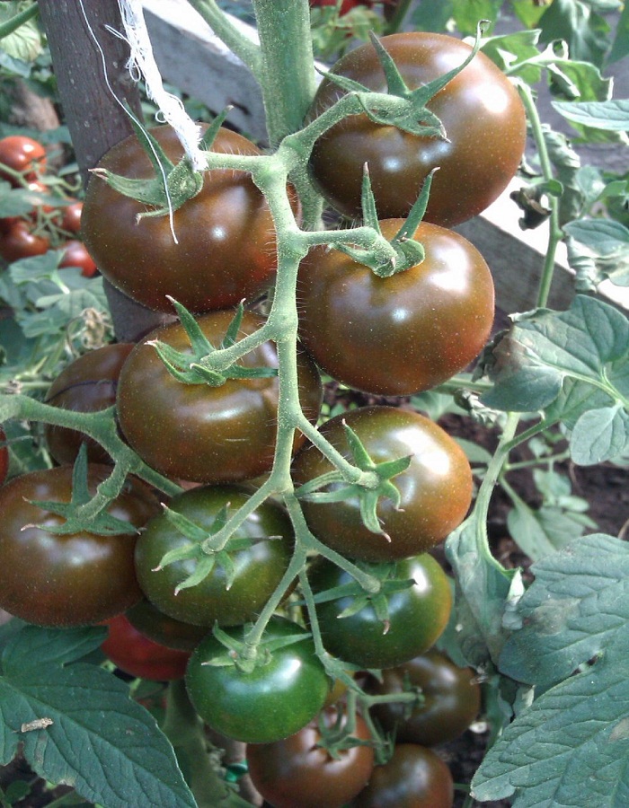 Этот инновационный гибрид полученный классическим способом, без использования ГМО, по истине считают чудом в селекции томатов.Раннеспелый, индетерминантный гибрид для закрытого грунта. Кусты малолиственные, компактные и больше растут в высоту, а не в ширину,формировать стоит в 3-4 стебля. Кисть простая, состоящая из 7-10 плодов. Плоды округлые, глянцевые, массой 60-80 г, в начале формирования–зеленого окраса (как и обычные томаты), по мере вызревания он приобретает насыщенный иссиня-чёрно-фиолетовый окрас. Мякоть плотная,вишнёво-красного цвета. Плоды отличаются сильным ароматом, который чувствуется на расстоянии. У плодов отличное соотношение сахаров и