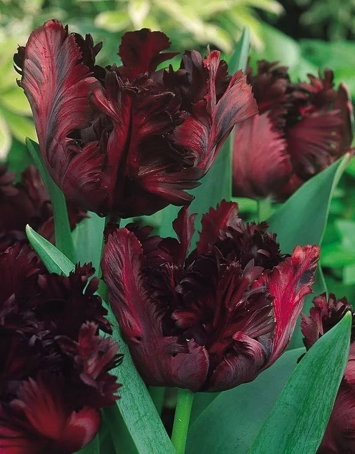 Тюльпан попугайный Блэк Пэррот — многолетнее луковичное растение высотой 45–50 см с необычными завораживающими цветками диаметром 10–11 см. Лепестки экзотической пурпурно-черной окраски с волнистыми изрезанными краями. Цветы больше похожие на гвоздики, чем на тюльпаны, совершенно восхитительны и экстравагантны. Тюльпан Блэк Пэррот широко используют как для озеленения и украшения клумб, так и для букетов.