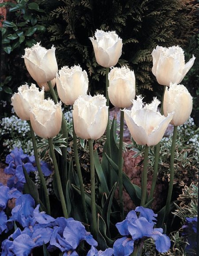 Тюльпан бахромчатый Сван Уингз — многолетнее луковичное растение высотой 45–50 см с необычными завораживающими цветками диаметром 10–12 см. Лепестки белоснежные, по краю игольчато-бахромчатые, образуют шикарный восхитительный бокал. Тюльпан Сван Уингз широко используют как для озеленения и украшения клумб, так и для букетов.