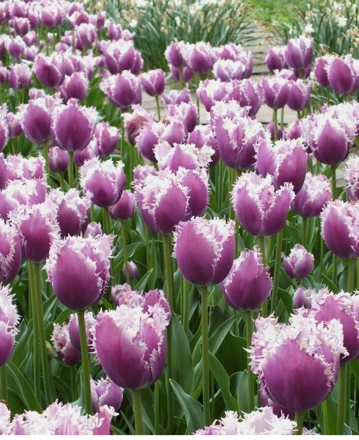 Тюльпан бахромчатый Камминз — многолетнее луковичное растение высотой 45–50 см с необычными завораживающими цветками диаметром 10–12 см. Лепестки фиолетово-пурпурные с белой каймой, по краю игольчато-бахромчатые, образуют шикарный восхитительный бокал. Тюльпан Камминз широко используют как для озеленения и украшения клумб, так и для букетов.