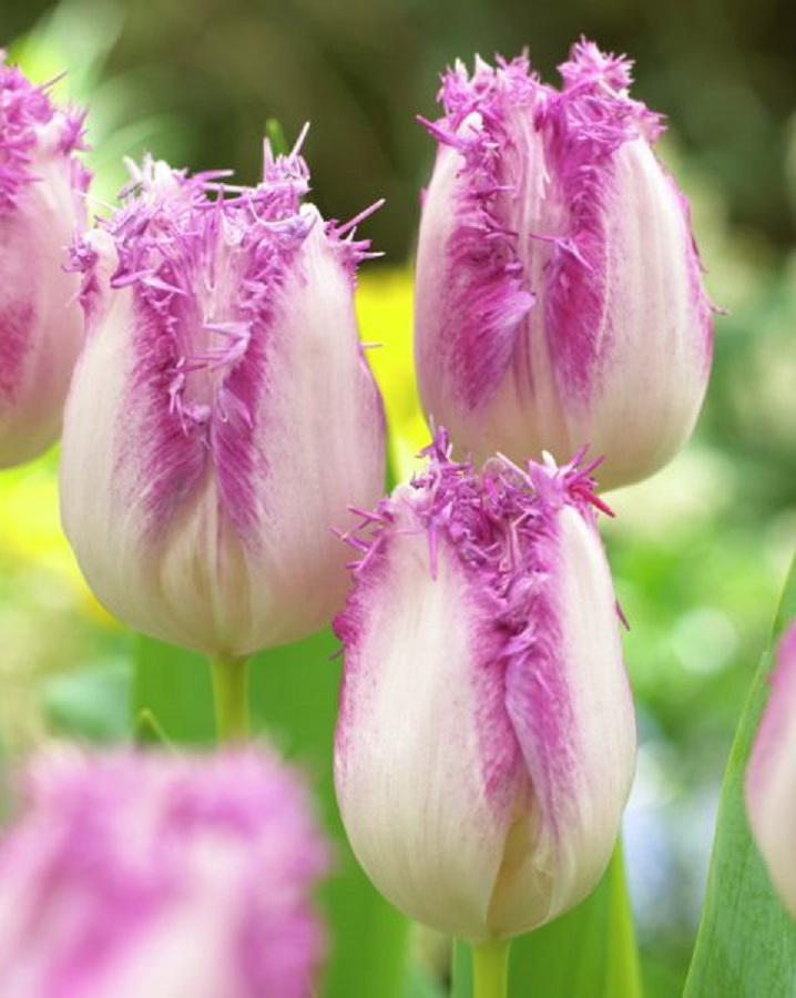 Тюльпан бахромчатый Ариа Кард — многолетнее луковичное растение высотой 45–50 см с необычными завораживающими цветками диаметром 10–12 см. Лепестки белоснежные с сиреневой каймой, по краю игольчато-бахромчатые, образуют шикарный восхитительный бокал. Тюльпан Ариа Кард широко используют как для озеленения и украшения клумб, так и для букетов.