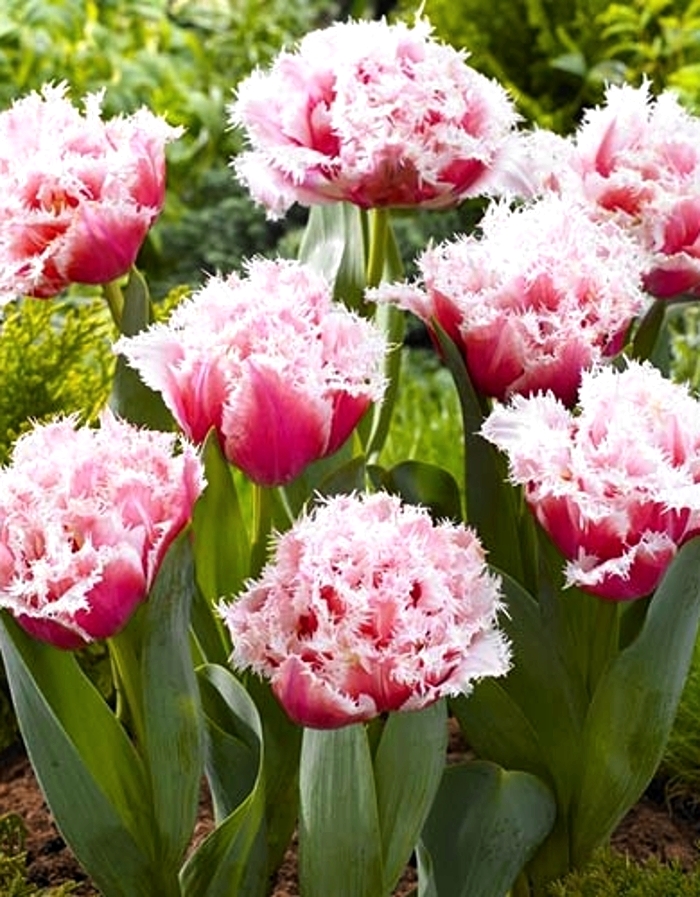Цветы тюльпана Куинсленда очень крупные, густомахровые. Цвет лепестков – розовый, светлеющий по краям. Самая светлая часть получается на бахроме, которая визуально кажется подсвеченной.