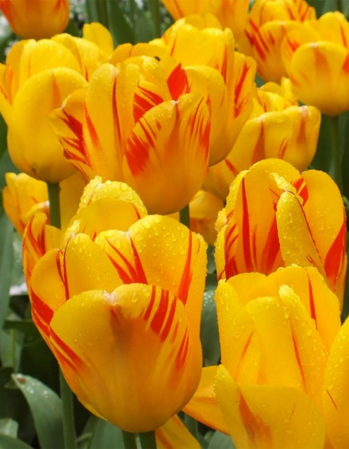 Тюльпан Олимпик Флейм (Дарвинов гибрид) — многолетнее луковичное растение высотой 55-60 см с необычными завораживающими цветками диаметром 10-12 см. Лепестки желтого цвета, с красными перистыми мазками по краю, образуют шикарный восхитительный бокал. Тюльпан Олимпик Флейм широко используют как для озеленения и украшения клумб, так и для букетов.