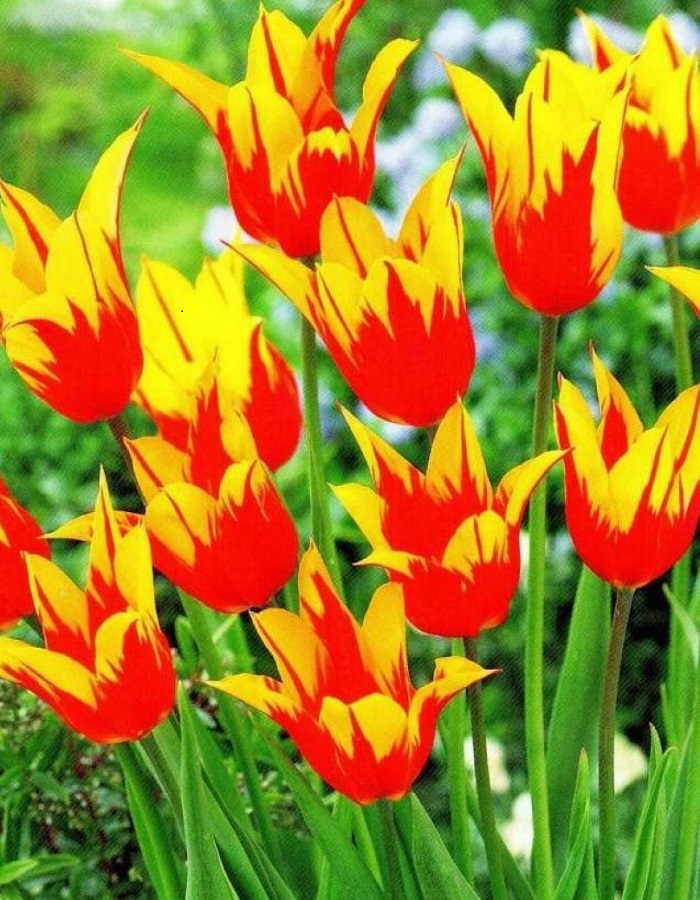 Тюльпан лилиецветный Файр Уингз - высокорослый, яркий сорт. Стебли прочные. Цветки очень эффектные, ярко-красные с желтыми краями. Лилиецветные тюльпаны очень изящны и имеют крепкие цветоносы. Заостренные лепестки отогнуты наружу. Используются для озеленения садов и парков, выращивания в контейнерах, а также для срезки. Лилиецветные тюльпаны великолепно смотрятся на фоне вечнозеленых кустарников и в миксе с другими весеннецветущими растениями.