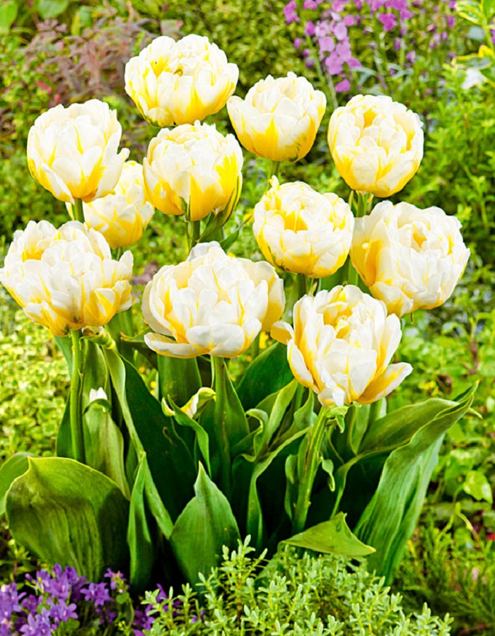 Тюльпан Фламинг Эвита (махровый поздний) — многолетнее луковичное растение высотой 50 см с необычными завораживающими цветками диаметром 10 см. Множество бело-жёлтых лепестков образуют шикарный восхитительный бокал. Тюльпан Фламинг Эвита широко используют как для озеленения и украшения клумб, так и для букетов.