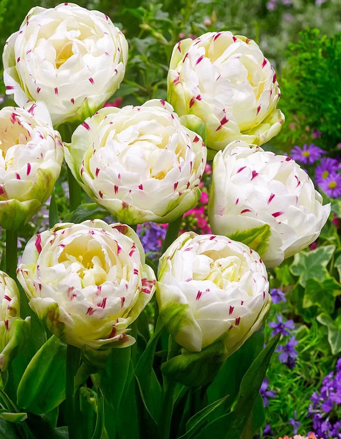 Пышный махровый цветок жемчужного цвета с красными штрихами по верху лепестков – это тюльпан махровый Дэнс Лайн, роскошный и изумительный. На каждой клумбе этот сорт заметен и эффектен. Тюльпан прекрасно подходит для выращивания на срезку, из этих цветов легко создать эксклюзивные букеты.