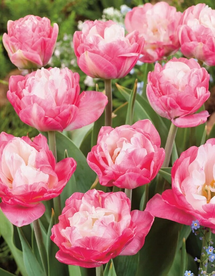 Относится к группе Махровые поздние. Высота растения до 50 см. Цветок густомахровый, напоминающий цветок пиона (пионовидный). Размер бутона 6-7 см в высоту и 8-10 см в диаметре. Окрас цветка многоярусный, ярко-розовый с перламутром, при раскрытии внутри белый с желтым центром, крупный, похож на цветок пиона. Посадка - август, сентябрь, октябрь. Глубина посадки зависит от размера луковицы и её определяют как 3 высоты луковицы, если считать от её донца, а густоту - как 2 диаметра луковицы. Период цветения - май - июнь. Почва - нейтральная или известково - кислая. Использование махровых тюльпанов: декоративные посадки, срезка, ускоренная выгонка. К достоинствам махровых поздних тюльпанов можно отнести: долго не увядающие цветки, высокие крепкие цветоносы и сравнительно продолжительный период цветения, длящийся в среднем три недели.