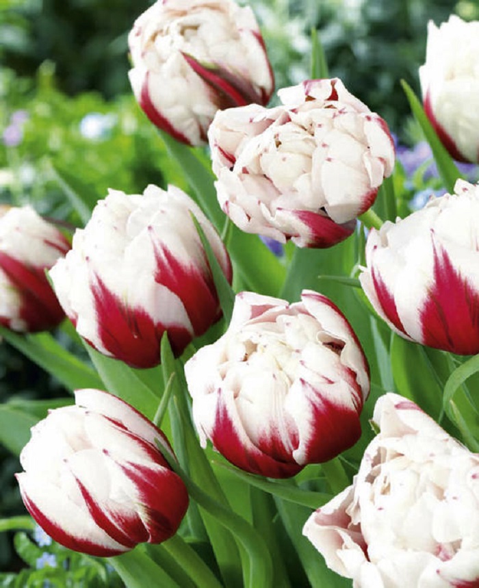 Тюльпан Горизонт (махровый поздний) — многолетнее луковичное растение высотой 45 см с необычными завораживающими цветками диаметром 10 см. Множество малиново-красных лепестков с белоснежными краями образуют шикарный восхитительный бокал. Тюльпан Горизонт широко используют как для озеленения и украшения клумб, так и для букетов.