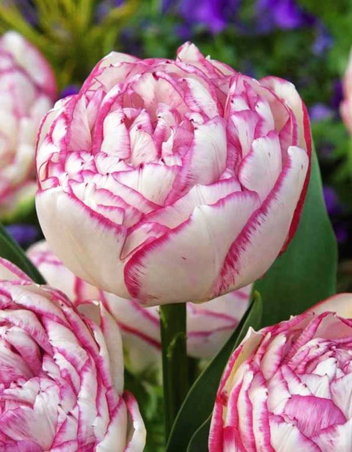 Тюльпан Дабл Тач (махровый ранний) — многолетнее луковичное растение высотой 40–45 см с необычными завораживающими цветками диаметром 10–12 см. Множество белоснежных лепестков с тонкой розовой каймой образуют шикарный восхитительный бокал. Тюльпан Дабл Тач широко используют как для озеленения и украшения клумб, так и для букетов.