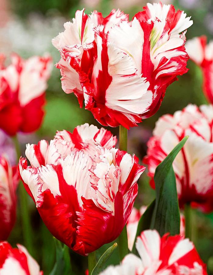 Тюльпан попугайный Эстелла Рижнвельд — многолетнее луковичное растение высотой 50 см с необычными завораживающими цветками диаметром 10–15 см. Лепестки экзотической красно-белой окраски с волнистыми изрезанными краями. Цветы больше похожие на гвоздики, чем на тюльпаны, совершенно восхитительны и экстравагантны. Тюльпан Эстелла Рижнвельд широко используют как для озеленения и украшения клумб, так и для букетов.