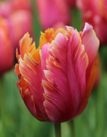 Тюльпан Амазинг Пэррот поражает своей экстравагантной красотой и яркостью! Его заметят все при первом же осмотре ваших садовых композиций! Крупные тёмно-розовые бутоны раскрываются, показывая языки оранжевого пламени по краю гофрированных попугайных лепестков. Цветоносы очень крепкие, вырастают до 55 см.