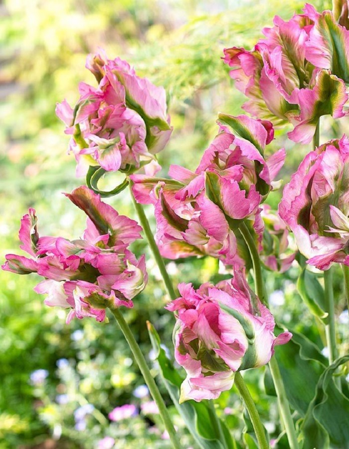 Тюльпан попугайный Грин Вейв - необычайно декоративный сорт! Цветок ярко-розового оттенка с широкой зеленой прожилкой вдоль гофрированных лепестков. Попугайные тюльпаны ценятся за необычный, экзотический вид: лепестки их имеют глубоко изрезанные края, иногда волнистые, чем напоминают растрепанные птичьи перья. Размножаются хорошо. Используются, главным образом, для оформления садов и парков, при этом следует размещать их отдельно от остальных тюльпанов, ближе к дорожкам, чтобы в полной мере оценить их фантазийную красоту.