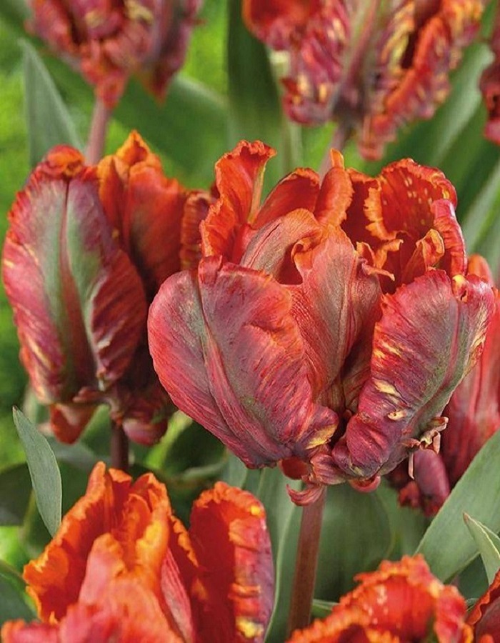 Тюльпан попугайный Блюмекс — многолетнее луковичное растение высотой 50 см с необычными цветками диаметром 10 см. Лепестки экзотической формы, похожие на перья птиц, с волнистыми краями. Цветы завораживающей оранжево-красно-зеленой окраски восхитительны и экстравагантны. Тюльпан Блюмекс широко используют как для озеленения и украшения клумб, так и для букетов.