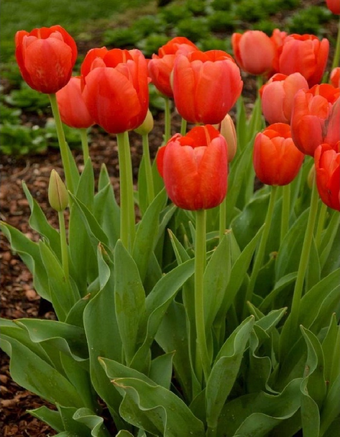 Тюльпан Скай Хай Скарлет (простой поздний) — многолетнее луковичное растение высотой 60 см с необычными завораживающими цветками диаметром 10–12 см. Красно-алые лепестки образуют шикарный восхитительный бокал. Тюльпан Скай Хай Скарлет широко используют как для озеленения и украшения клумб, так и для букетов.