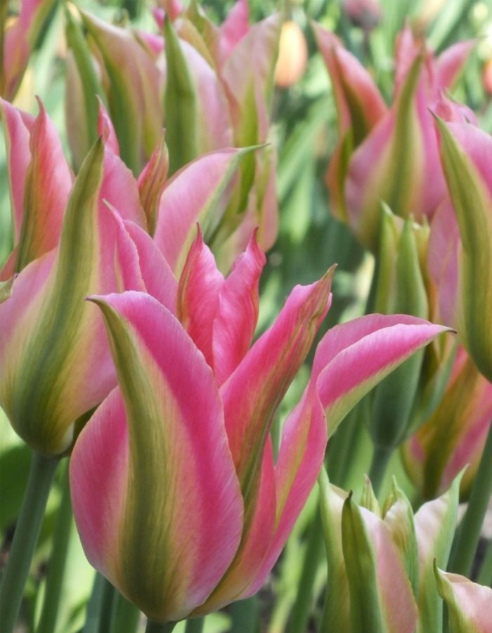 Тюльпан «Кристмас Экзотик». Высота 45 см. Диаметр 10 см. Цвет розовый с зелеными штрихами.