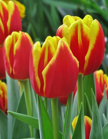 Тюльпан Денмарк (класс Триумф) — многолетнее луковичное растение высотой 40–45 см с необычными завораживающими цветками диаметром 10–12 см. Лепестки ярко красного цвета с широкой желтой каймой по краям образуют шикарный восхитительный бокал. Тюльпан Денмарк широко используют как для озеленения и украшения клумб, так и для букетов.