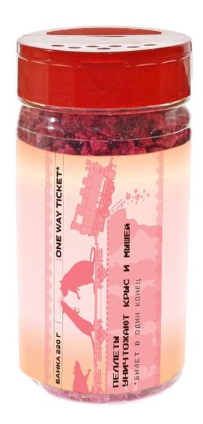 ОNE WAY TICKET пеллеты для уничтожения крыс и мышей в ПЭТ-банке с дозирующей крышкой (флип-топ). Усиленное действие - дубль-эффект т.к содержит сразу 2 действующих вещества: бродифакум и изоцин. Высокая привлекательность для грызунов, снижение чувства опасности.Экономичность-убивает большое число грызунов меньшим количеством приманки.Удобен и безопасен в раскладке. Тушки умерших грызунов мумифицируются и не издают неприятного запаха.