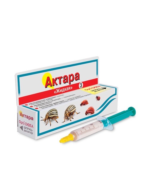 ОписаниеЖидкая «Актара» - средство от колорадского жука. Инсектицид кишечно-контактного действия против сосущих (тли, цикадки, белокрылка), грызущих (колорадский жук, пьявица, блошки) насекомых. Одной ампулы (1,2 мл) достаточно для обработки 2 соток.Составконцентрат суспензии тиаметоксама, 240 г/л.Применениеналить в ведро 1–2 л воды, вскрыть флакон, отмерить мерным колпачком нужный объем препарата, вылить в ведро с водой и тщательно перемешать, затем довести рабочий раствор до требуемого объема в соответствии с таблицей и перемешать еще раз.