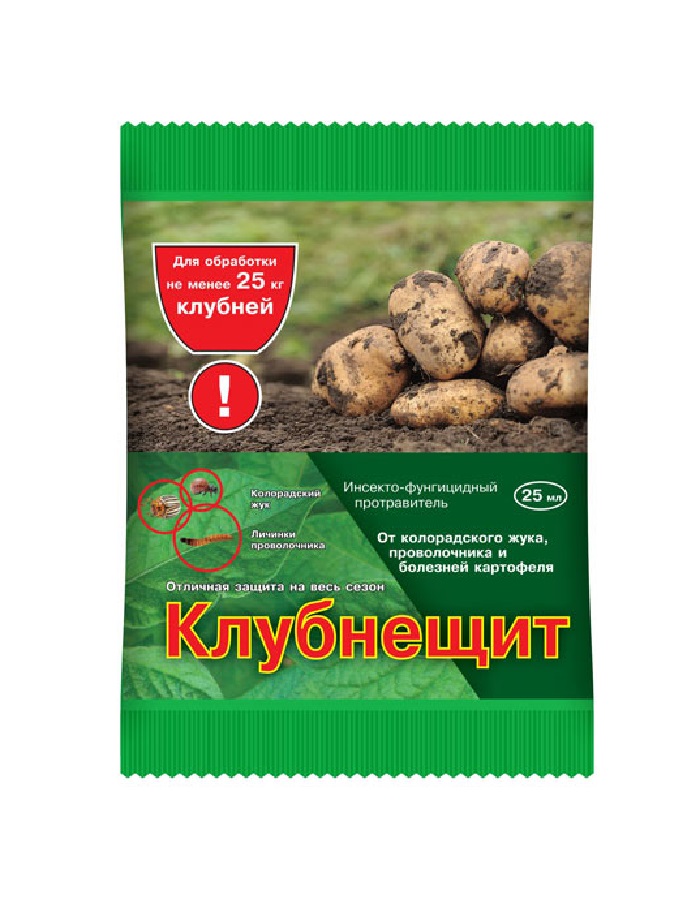 Препарат предназначен для обработки клубней перед посадкой. Защищает картофель от проволочника, от колорадского жука и от комплекса болезней.