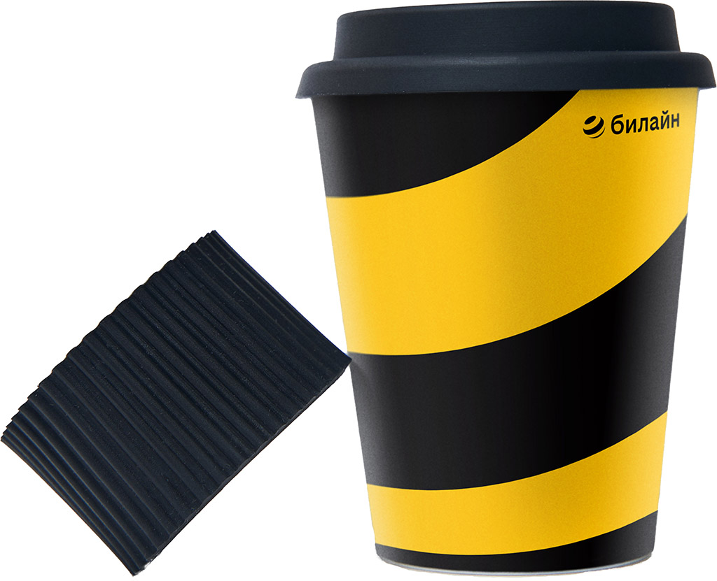 Термостакан для горячих напитков из лимитированной коллекции мерча билайна к 30-летию компании. Крышка не даст твоему кофе остыть во время прогулок, а капхолдер из чёрного матового силикона — обжечься.