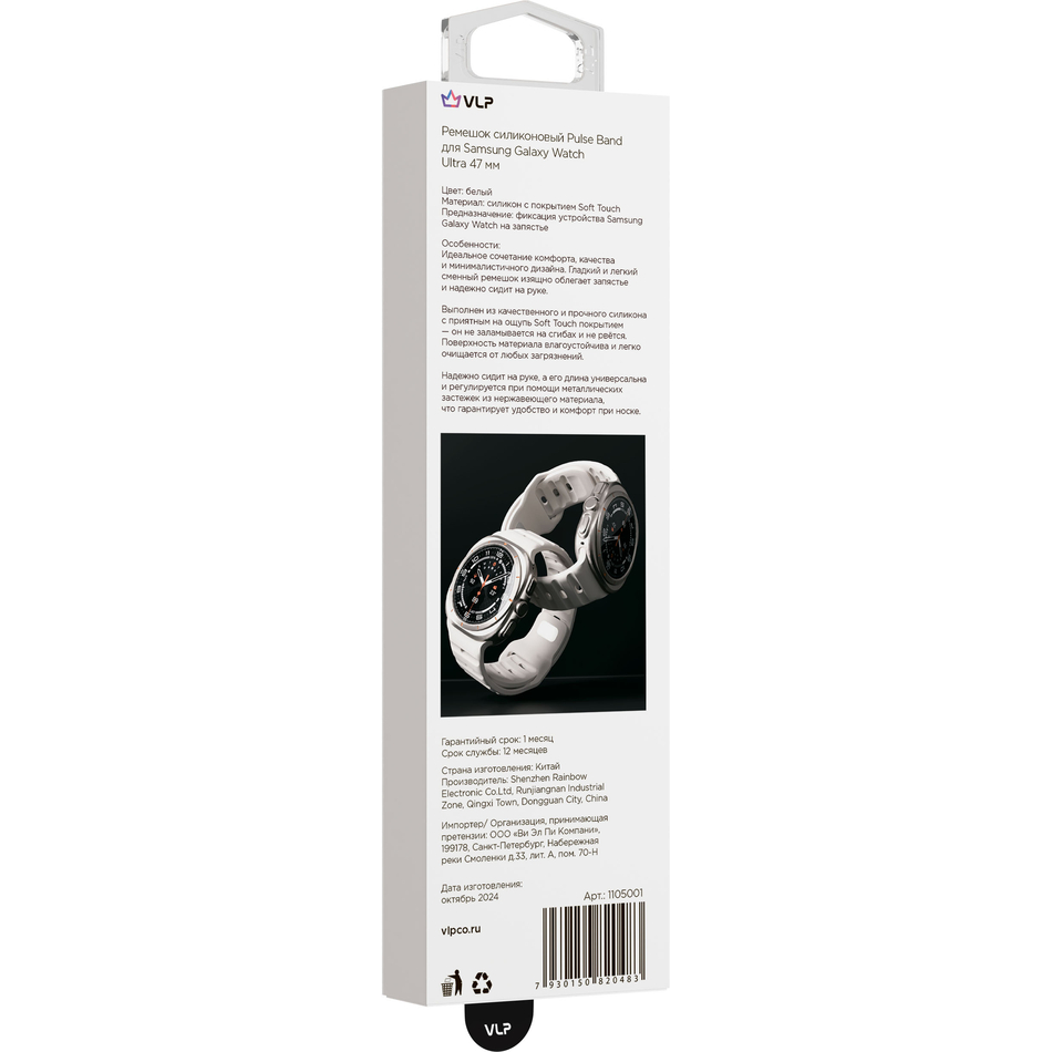 Ремешок VLP для смарт-часов Samsung Watch Ultra 47 мм сочетает комфорт, надёжность, качество и лаконичный дизайн. Гладкий и лёгкий сменный ремешок изящно облегает запястье. Он выполнен из качественного и прочного силикона с приятным на ощупь покрытием софт-тач — он не заламывается на сгибах и не рвётся. Поверхность материала влагоустойчива и легко очищается от загрязнений. Длина ремешка универсальна и регулируется при помощи металлических застёжек из нержавеющего металла.