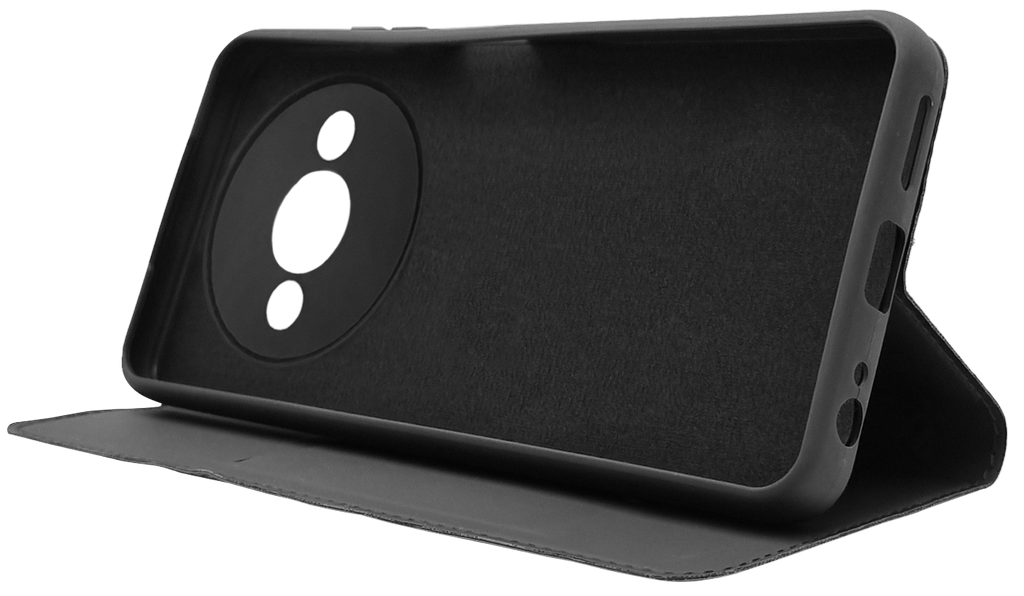 Внешний материал чехла-книжки BoraSCO для смартфона Xiaomi Redmi A3 | A3X — искусственная кожа с покрытием софт-тач, а каркас сделан из силикона. Для надёжной фиксации крышки предусмотрен магнит, который располагается сбоку, не мешая пользоваться смартфоном. Чехол может служить подставкой и имеет кармашек для пластиковых карт.