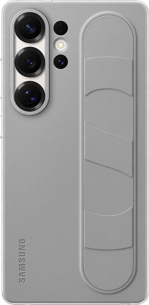 Samsung Standing Grip Case для смартфона Galaxy S25 Ultra — клип-кейс с интегрированным ремешком-держателем. У него тонкий корпус и прозрачная рамка.
