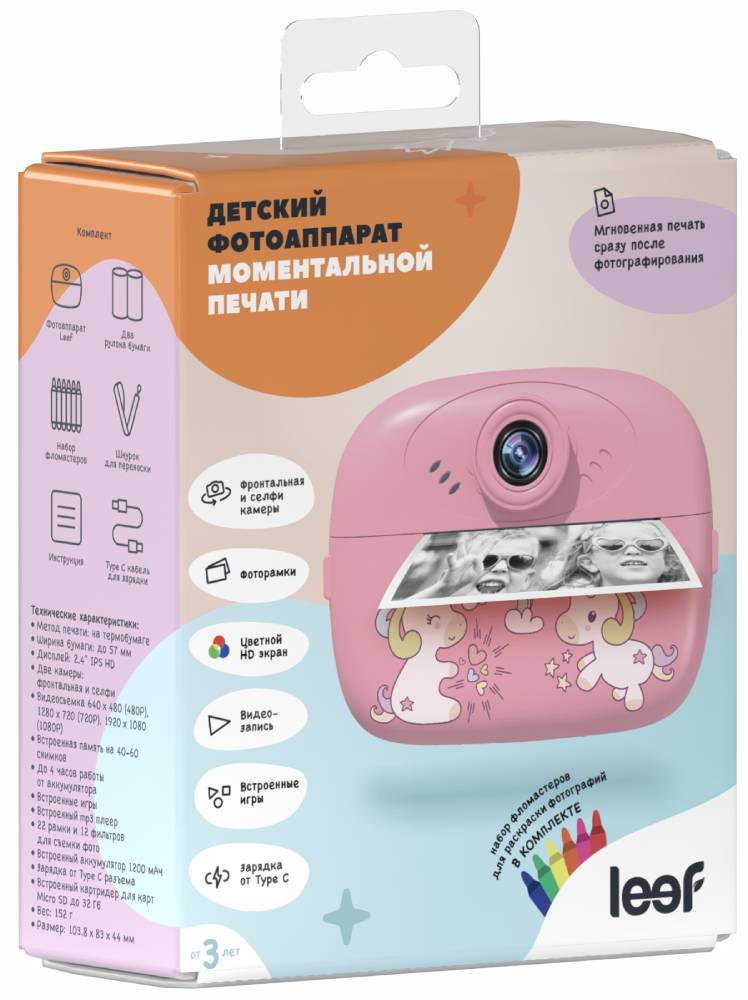 2.4 дюйма, на котором можно просматривать снимки. Две камеры — основная и селфи — дают возможность делать фото с разных ракурсов. Поддерживается видеосъемка в разрешении до 1080p (Full HD), доступны 22 забавные рамки и 9 фильтров, которые делают процесс съемки еще интереснее и помогают проявить фантазию. Удобное меню и интуитивно понятные кнопки позволяют детям легко освоить управление без помощи взрослых. Мгновенная печать