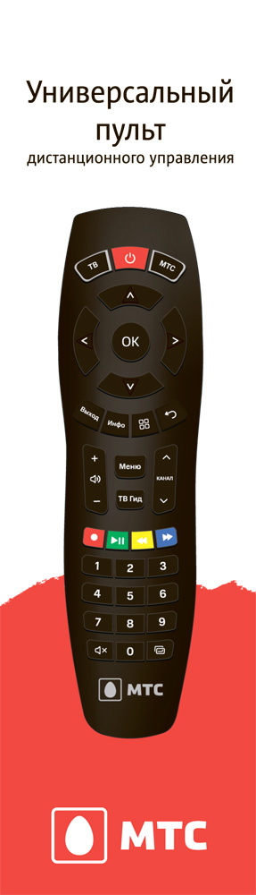 с логотипом МТС — универсальный гаджет для медиацентров IPTV. Пульт отличается превосходной эргономикой, удобными кнопками с приятным тактильным откликом и качественным исполнением. Устройство поддерживает управление основными функциями телевизора: выбор каналов, переключение громкости, пуск, пауза, перемотка и прочее.