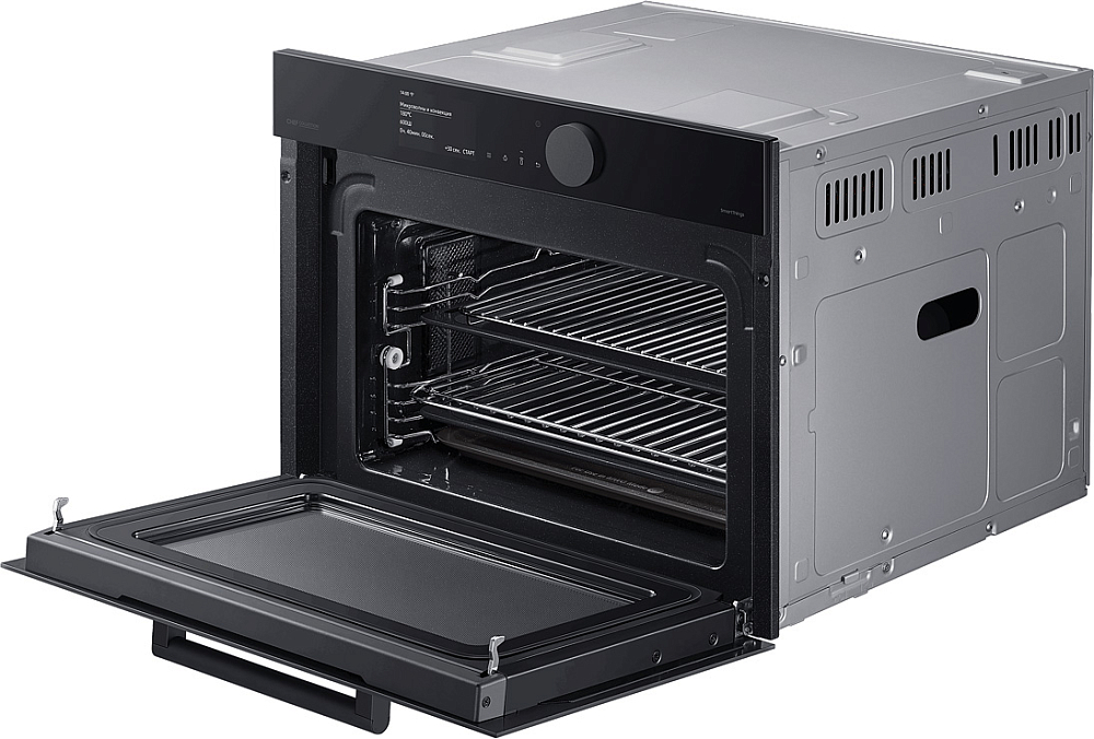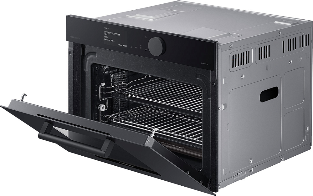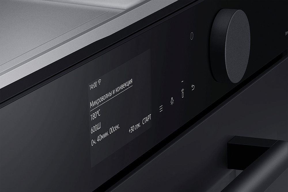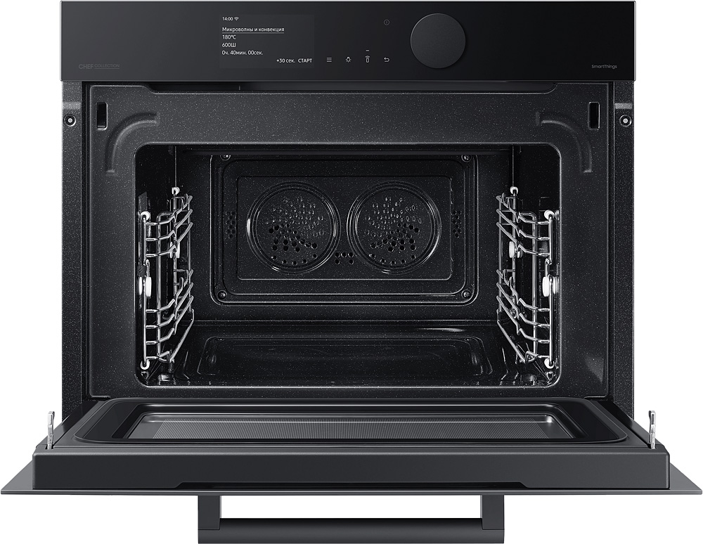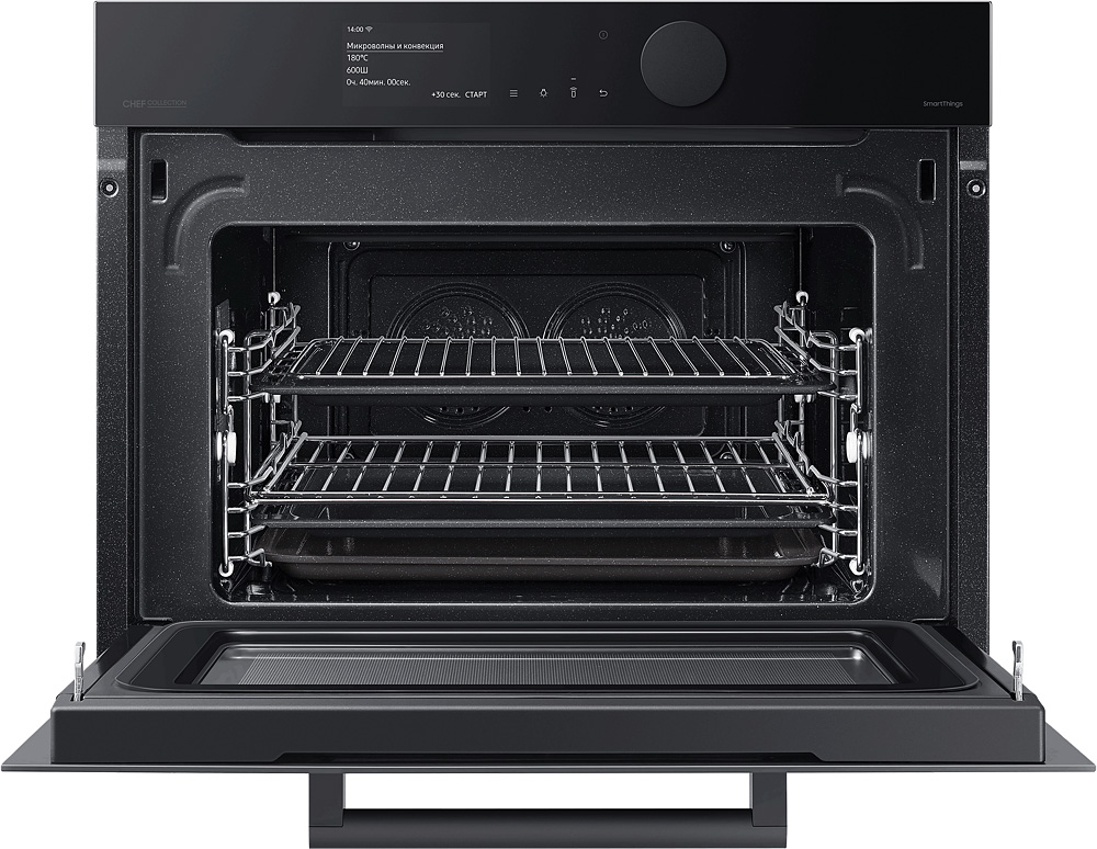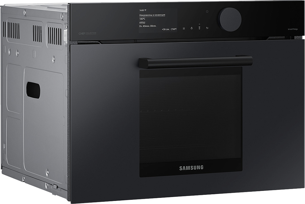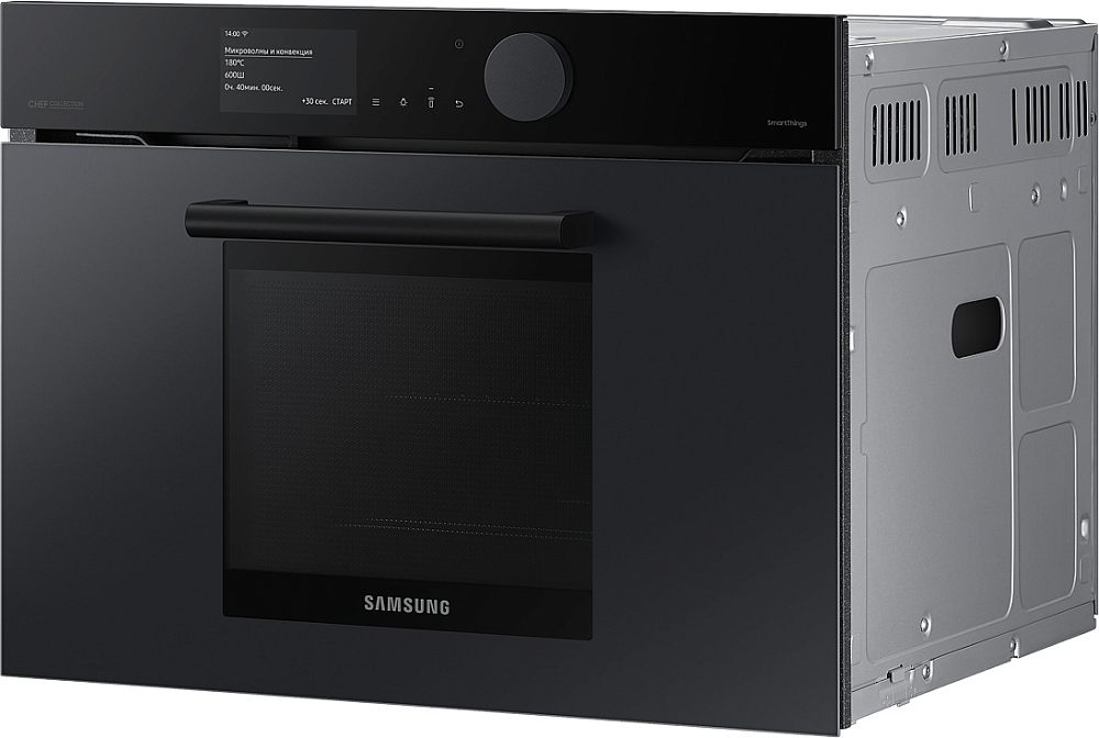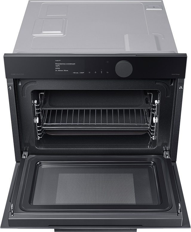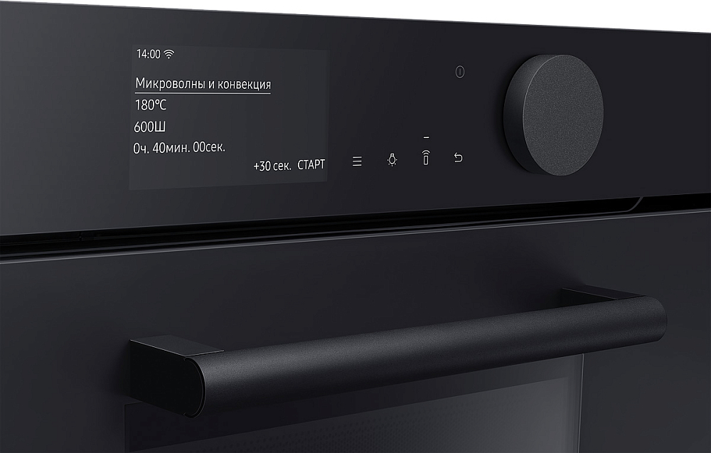 Гармония дизайна на вашей кухне Создайте кухню своей мечты - которая будет работать, ощущаться и выглядеть лучше. Приборы Samsung Infinite line™ отличаются изысканным дизайном с бесшовными плоскими поверхностями, которые привлекают внимание. Широкий ряд передовых технологий обеспечивает динамичную и многофункциональную работу. Премиальное исполнение из матового стекла Добавьте кухне более премиальный вид и тактильные ощущения с помощью стеклянной дверцы Satin Glass. Его антибликовая технология имеет матовую текстуру, поэтому оно гармонично сочетается с современной кухонной техникой и мебелью. Для поддержания великолепного внешнего вида на стекле имеется покрытие против отпечатков пальцев, предотвращающее появление нежелательных пятен. Быстрое и вкусное приготовление Готовьте вкусные блюда за гораздо меньшее время. В комбинированной микроволновой печи вы можете готовить пищу различными способами. Вы можете использовать ее как традиционную конвекционную печь. А также использовать микроволновую технологию для быстрого и тщательного приготовления пищи. А можно использовать и то, и другое одновременно! Удобное и понятное управление Наслаждайтесь более простым способом приготовления пищи. Сенсорный TFT дисплей и большой регулятор имеют роскошный дизайн со сдержанным интерфейсом. Интуитивно понятный дисплей показывает текущее состояние духовки. Вы также можете удобно управлять рядом функций простым прикосновением или поворотом регулятора. Простое и удобное управление в любое время и в любом месте Экономьте время и делайте гораздо больше благодаря возможности подключения по Wi-Fi. Просто наблюдайте за работой духовки и управляйте ею в любое время и в любом месте с помощью приложения. Вы можете предварительно разогреть или выключить ее, проверить и отрегулировать температуру и время приготовления. Руководство по приготовлению также рекомендует оптимальный режим приготовления для каждого блюда и показывает рецепты. Больше энергоэффективности, меньше затрат Сделайте свой дом более энергоэффективным и экономьте деньги на счетах за электричество. Духовка имеет маркировку энергоэффективности A+, поэтому доказано, что она потребляет меньше энергии, чем обычные духовые шкафы, без ущерба для производительности или функциональности. Готовьте чаще, готовьте разнообразнее Создавайте больше блюд с помощью огромной духовки объемом 50 литров. Она открывает больше возможностей в домашней кулинарии. Вы можете приготовить несколько блюд на разных уровнях, например, овощи, выпечку, запеканки или блюда из макарон. Или же в ней можно легко разместить крупные блюда, например, большое жаркое или индейку. Готовьте намного быстрее и равномернее Экономьте время и готовьте блюда более равномерно благодаря двойным вентиляторам. Два нагревающихся вентилятора распределяют тепло по всей духовке и поддерживают постоянную температуру во всех местах. Это означает, что блюда всегда готовятся быстро и тщательно. Духовка отлично подходит для выпечки и жарки, и вы всегда сможете наслаждаться вкуснейшими блюдами. Легкое и плавное скольжение полок Ставить в духовку и доставать из нее блюда стало намного легче. 2 телескопические направляющие на верхнем и нижнем уровнях скользят плавно и почти без усилий, даже с тяжелыми сковородами. Они выдвигаются 
