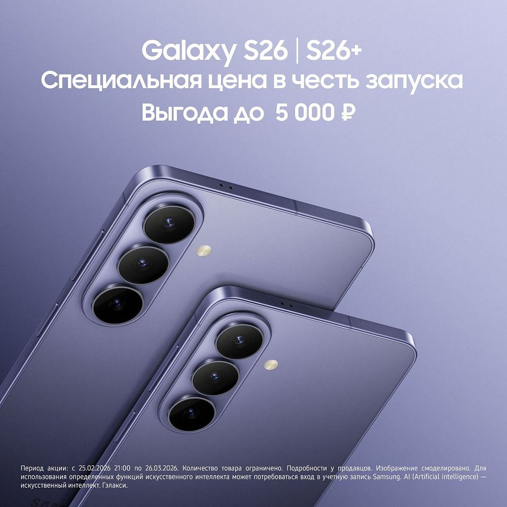 Экран, который остаётся удобным 6,3-дюймовый FHD+ Dynamic AMOLED 2X — оптимальный размер для тех, кто ценит компактность. Смартфон удобно лежит в руке, легко управляется одной рукой и при этом сохраняет плавность и насыщенность изображения благодаря адаптивной частоте обновления до 120 Гц. Компактность с характером Galaxy S26 стал тоньше и легче, сохранив фирменный стиль серии. Он ощущается аккуратным, собранным и современным. Это смартфон, который действительно удобно носить с собой каждый день. Первый массовый чип 2 нм Exynos 2600, выполненный по 2-нм техпроцессу, — ключевое преимущество Galaxy S26. Он обеспечивает высокую энергоэффективность и производительность, позволяя смартфону работать дольше и стабильнее. Камера, которая не подводит Тройная камера с основным модулем 50 МП и телеобъективом 3x ориентирована на универсальность. Она быстро фокусируется, точно передаёт цвета и позволяет снимать уверенно в большинстве сценариев — от семейных кадров до городских прогулок. Ночные кадры без лишней обработки Алгоритмы шумоподавления работают аккуратно, не разрушая атмосферу кадра. Фото и видео в темноте сохраняют детали и выглядят естественно, без агрессивной цифровой коррекции. Фронтальная камера для живых автопортретов Селфи выглядят естественно благодаря сбалансированной работе AI ISP. Камера подчёркивает детали, но не превращает лицо в «маску», сохраняя природную красоту. AI, который экономит время Galaxy AI в S26 помогает в повседневных задачах: от перевода и поиска до работы с текстами и изображениями. Он встроен в интерфейс и всегда доступен в нужный момент. Умные уведомления Система приоритетов автоматически выделяет важные уведомления, сокращая информационный шум. Вы быстрее видите главное и реже отвлекаетесь на второстепенное. Новая среда в One UI Интерфейс в Galaxy S26 ощущается лёгким и чистым. Улучшенные анимации, адаптивные элементы и гибкие настройки создают ощущение порядка и контроля. Аккумулятор, который стал больше Батарея на 4300 мА·ч — заметный шаг вперёд для компактного смартфона. В сочетании с энергоэффективным процессором это даёт уверенную автономность на целый день. Молниеносная и безопасная зарядка Поддержка быстрой и беспроводной зарядки позволяет быстро восполнить заряд и не зависеть от розетки. Минимум размера — максимум смысла Galaxy S26 — для тех, кто не хочет большой смартфон, но желает все ключевые возможности серии S26. Он компактный, сбалансированный и по-настоящему умный.