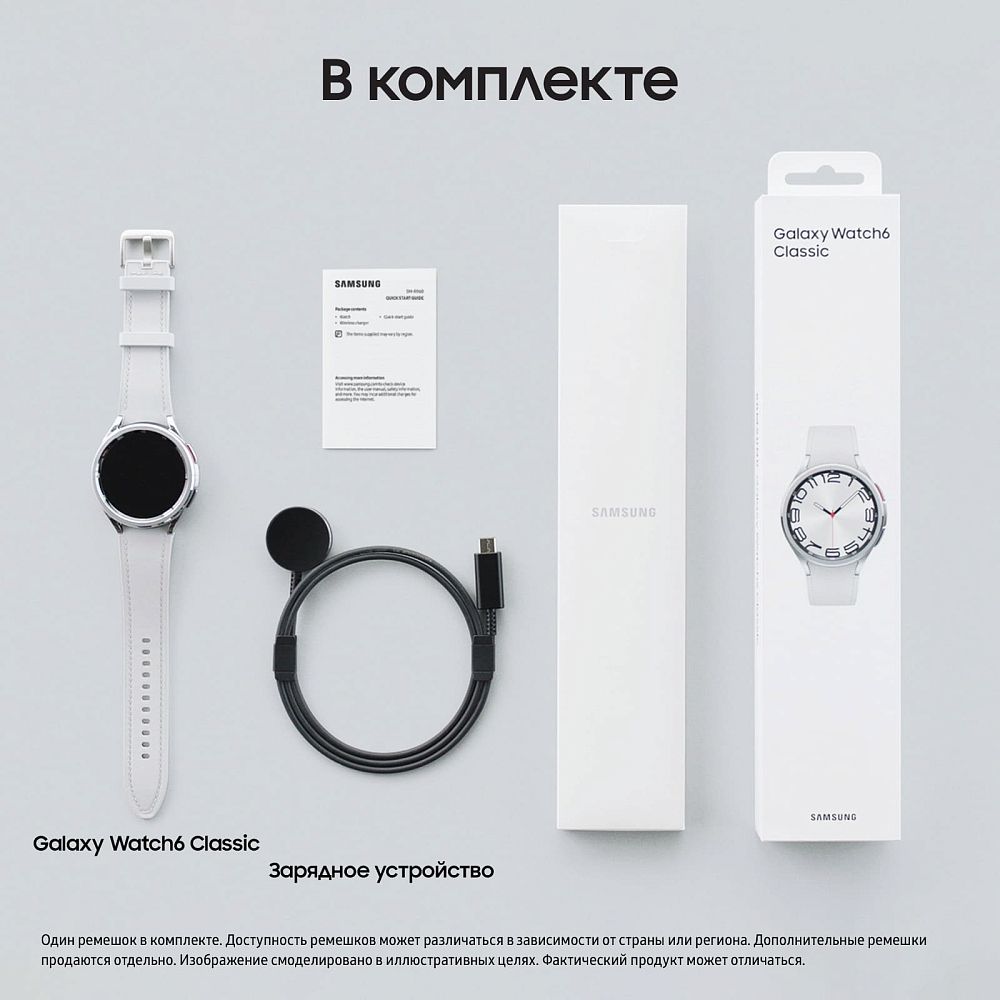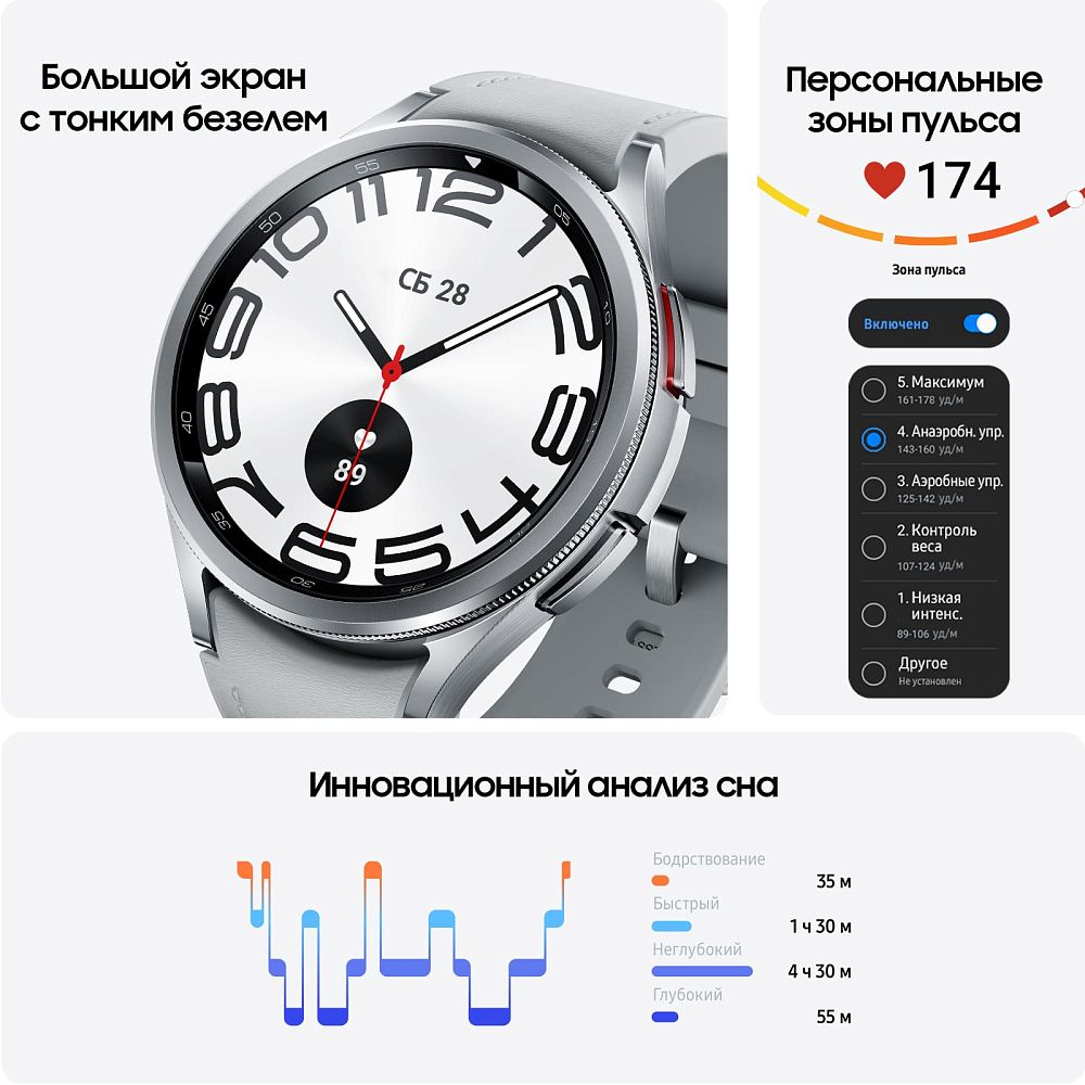 Watch 6 classic Samsung Galaxy Watch6 Classic сочетают передовые технологии и классическую, проверенную временем эстетику. Стильный металлический корпус и тонкий вращающийся безель вызывают ассоциации с премиальными механическими часами, делая Watch6 Classic элегантным аксессуаром, который хорошо гармонирует с любым костюмом. Защищены от воды, пыли и царапин Класс защиты Samsung Galaxy Watch6 Classic соответствует стандарту IP68: часы выдерживают погружение на глубину 1 метр и давление 5ATM. Экран прикрыт прочнейшим сапфировым стеклом, которое надёжно защищает его от царапин и механических повреждений. Быстрый запуск приложений и улучшенная автономность Благодаря процессору, который стал на 18% производительнее, приложения стали запускаться ещё быстрее. Аккумулятор обеспечивает Galaxy Watch6 Classic до 40 часов автономности, а поддержка быстрой зарядки позволяет восполнить 45% ёмкости всего за 30 минут. Помогут улучшить сон Samsung Galaxy Watch6 Classic - идеальный гаджет для тех, кто хочет улучшить качество сна. Мониторинг глубокой и быстрой фаз, безошибочная фиксация пробуждений и двигательной активности, персональные советы по отдыху и восстановлению, - это делает Watch6 Classic незаменимым помощником для всех, кто по-настоящему заботится о своём здоровье. Определят вашу персональную зону пульса Samsung Galaxy Watch6 Classic определят вашу персональную зону пульса и предупредят, когда частота сокращений станет слишко высокой или низкой. Вы будете видеть, когда пульс находится в зоне жиросжигания, а когда нужно снизить нагрузку. Кроме того, доступны ручные настройки, позволяющие самому выбирать свою целевую зону и активировать соответствующие уведомления. Достигайте большего С помощью функции анализа тренировок можно регистрировать свою ежедневную активности и видеть тренировочный прогресс. Часы помогут составить персональный график и достигать наилучших результатов без вреда для здоровья.