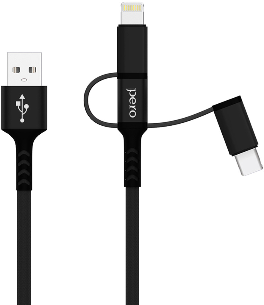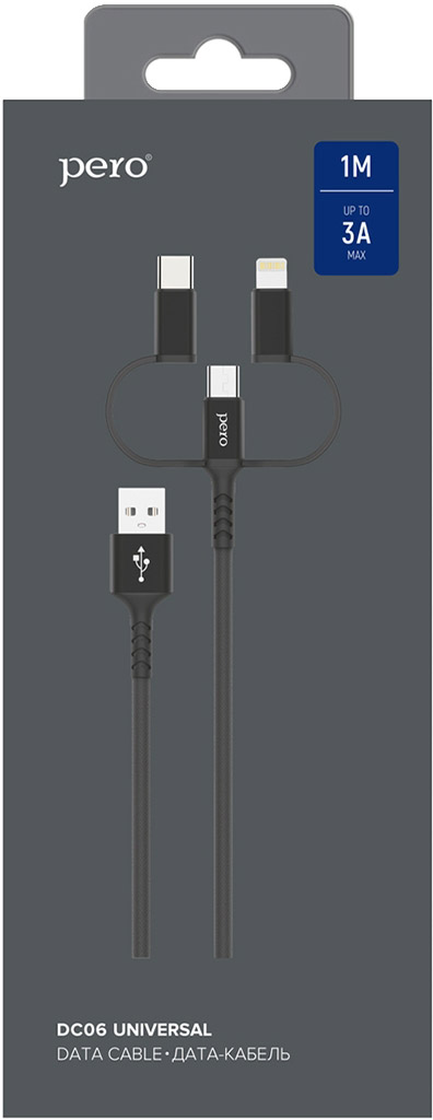 Универсальный USB-кабель Pero DC-06 — это модель круглой формы с металлическими коннекторами в тканевой оплетке с тремя коннекторами: Lightning, microUSB и USB-C. Кабель оснащён пластиковыми усилителями коннектора. Его пропускная способность — до 3 А.