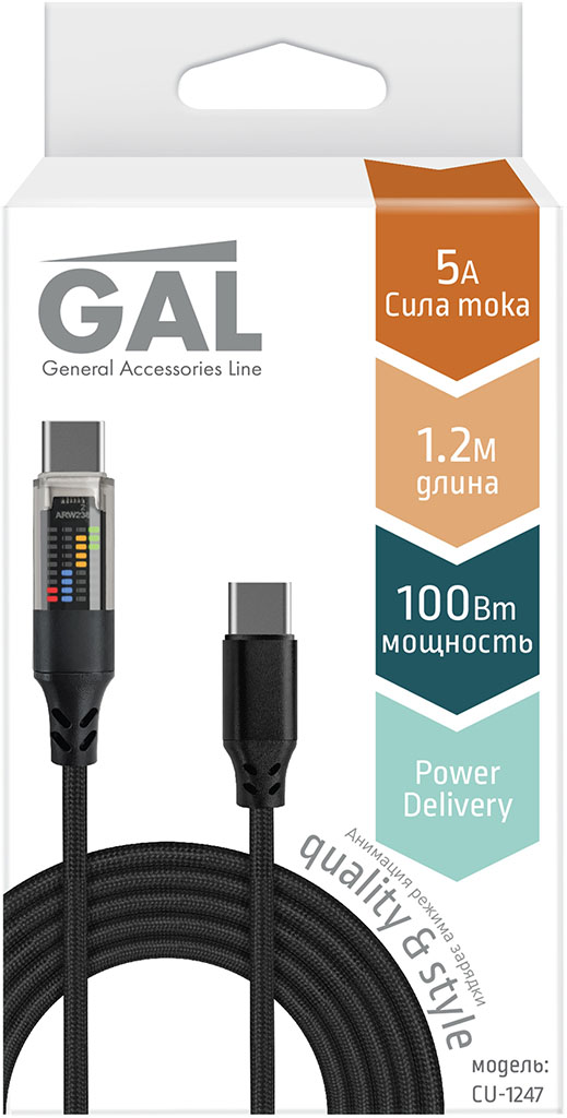 Кабель Gal CU-1247 позволяет подключать устройства с разъёмом USB-C к порту USB-C на компьютере для синхронизации и к адаптеру питания с USB-C для подзарядки. Жилы питания имеют увеличенный диаметр, что позволяет быстро заряжать смартфоны, планшеты и ноутбуки током до 5 А и мощностью до 100 Вт. Модель оснащена LED-экраном с анимацией режима зарядки. Нейлоновая оплётка обеспечивает дополнительную износостойкость, а увеличенная длина делает кабель максимально удобным.