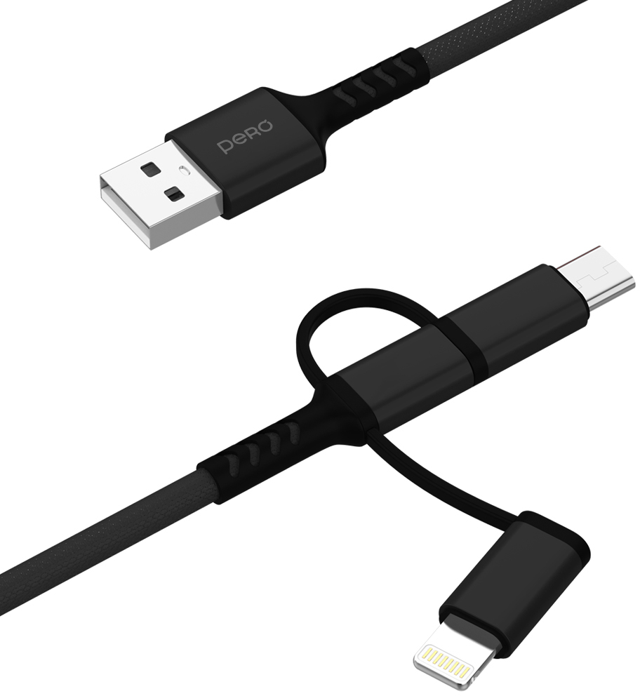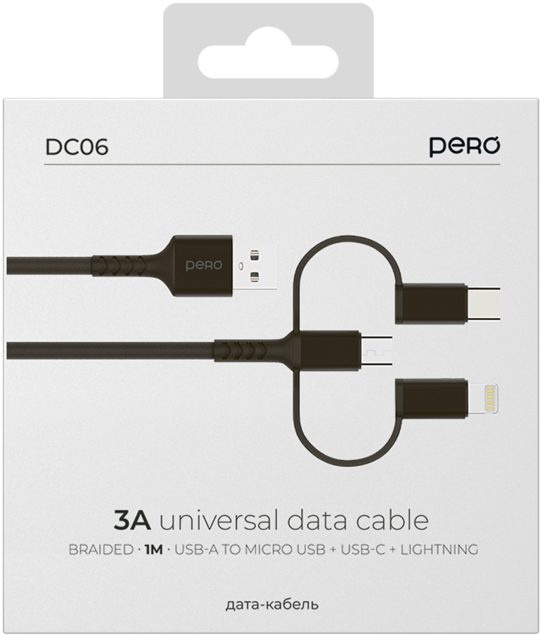 Универсальный USB-кабель Pero DC-06 — это модель круглой формы с металлическими коннекторами в тканевой оплетке с тремя коннекторами: Lightning, microUSB и USB-C. Кабель оснащён пластиковыми усилителями коннектора. Его пропускная способность — до 3 А.