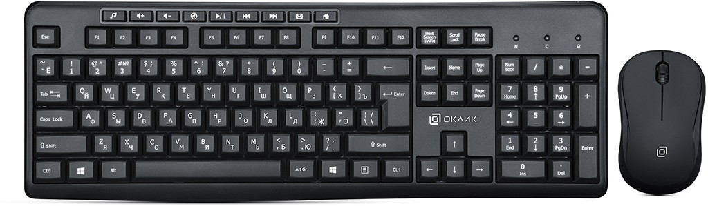 Беспроводной комплект из клавиатуры и мыши Oklick 225M — доступное решение для дома и офиса. На клавиатуре есть 9 дополнительных мультимедийных клавиш, выдвижные ножки позволяют регулировать наклон корпуса, а резиновые накладки предотвращают скольжение. Беспроводная мышь симметричная, поэтому подходит и для правой, и для левой руки. Покрытие софт-тач приятно на ощупь и предотвращает выскальзывание мыши из руки. Комплект работает с одним USB-ресивером на расстоянии до 10 метров.