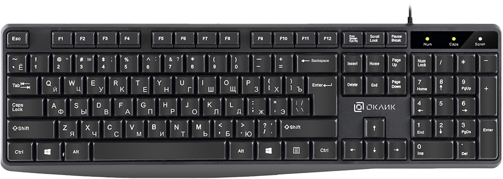 Клавиатура Oklick 145M выполнена в классическом строгом дизайне и имеет полноразмерную раскладку со 104 клавишами. Преимущество клавиатуры — долгий срок службы, её ресурса хватит на 10 млн кликов. 26 клавиш поддерживают технологию Anti-Ghosting, которая предотвращает фантомные нажатия. Таким образом, устройство поможет комфортно выполнять большинство повседневных офисных задач, включая работу с объёмными текстами и таблицами.