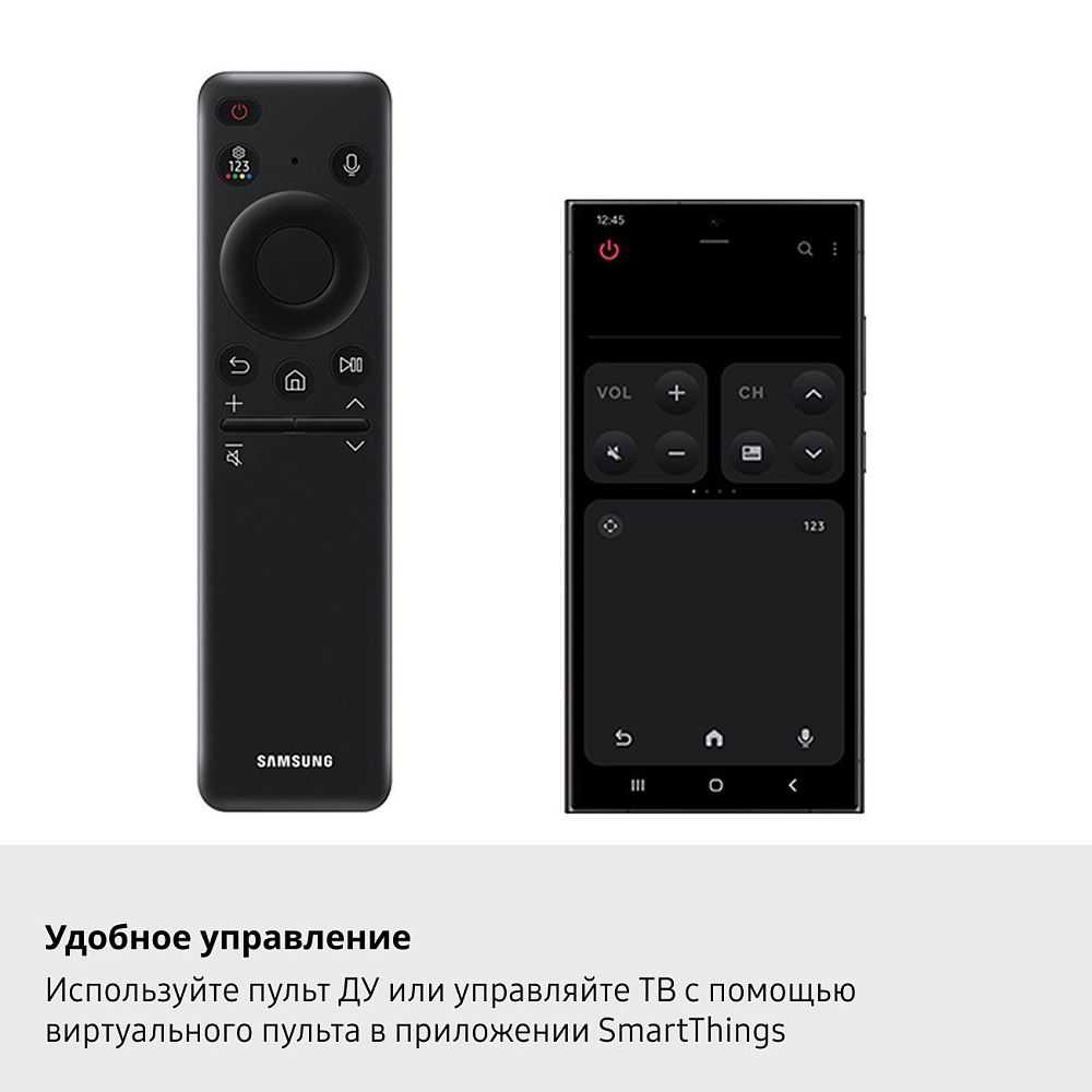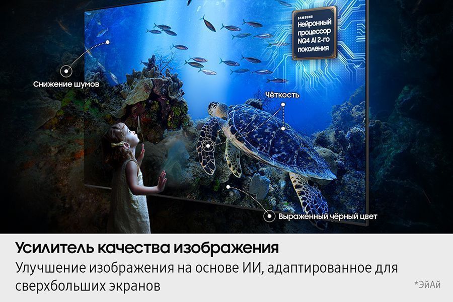 Интеллектуальный режим Интеллектуальный режим включает меню быстрого доступа для регулировки адаптивных настроек изображения и звука, а также обеспечивает умную оптимизацию работы телевизора с учетом окружающих условий и воспроизводимого контента. Технология адаптивного звука Adaptive Sound Pro Слушайте разборчивую речь и насыщенные сбалансированные звуки в первозданном виде. AI-процессор телевизора распознает различные звуки, например диалоги и фоновую музыку, и оптимизирует их с учетом типа и акустики в помещении, а затем доводит их до совершенства с помощью технологии ремастеринга аудио. Генеративные обои Выберите ключевые слова для нужной атмосферы и позвольте ИИ творить волшебство. Телевизор будет создавать неповторимые и прекрасные изображения, которые изменят облик вашего дома. Забота о питомцах Телевизор поможет присмотреть за питомцами, пока вас нет дома. Телевизор распознает звуки, например лай, с помощью микрофона, а затем автоматически включает любимый контент вашего питомца, чтобы его успокоить. Процессор NQ4 AI 2-го поколения Этот процессор использует мощности 20 нейронных сетей на базе ИИ для оптимизации изображения и звука. В результате вы можете насладиться превосходным качеством, пользуясь потоковыми ОТТ-сервисами, играя в любимые видеоигры или следя за спортивными трансляциями. Технология интеллектуального масштабирования 4K AI Upscaling Наслаждайтесь любимым контентом, не упуская ни единой детали. Наш AI-процессор может увеличить разрешение контента до 4K благодаря 20 нейронным сетям на базе ИИ, сохраняя при этом четкость деталей и плавность движения. Технология Color Booster Pro ИИ распознает каждую сцену и улучшает цветопередачу с учетом полученных данных, чтобы подарить вам более яркое и динамичное изображение. Neo Quantum HDR Наслаждайтесь более насыщенными и точными цветами в 4K-разрешении. Также вы сможете оценить более тонкие детали благодаря глубокому контрасту, создаваемому динамической тональной картой HDR10+, которая подстраивается под особенности каждой сцены. HDR10+ теперь доступен на стриминговых сервисах OTT. Motion Xcelerator 144 Гц Наслаждайтесь безупречным изображением на невероятно высоких скоростях. Уникальная технология динамического обновления Samsung обеспечивает плавные движения в играх с переменной частотой обновления в разрешении до 4K 144 Гц.