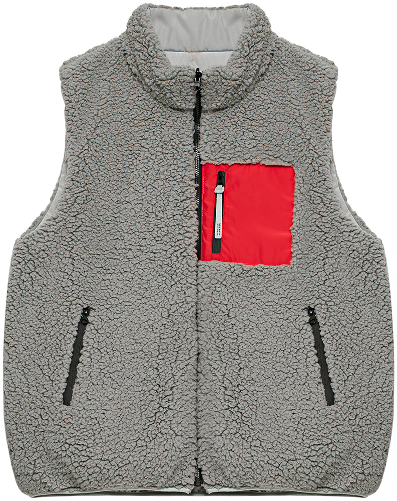 с красным карманом на груди и саржевой биркой на спине. Оснащен тремя удобными карманами.