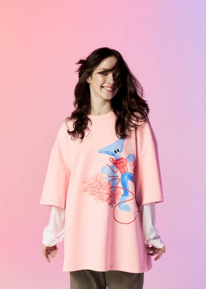 кроя с удлиненной линией плеча нежно-розового цвета.