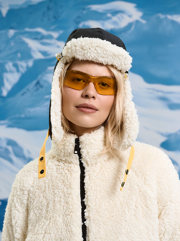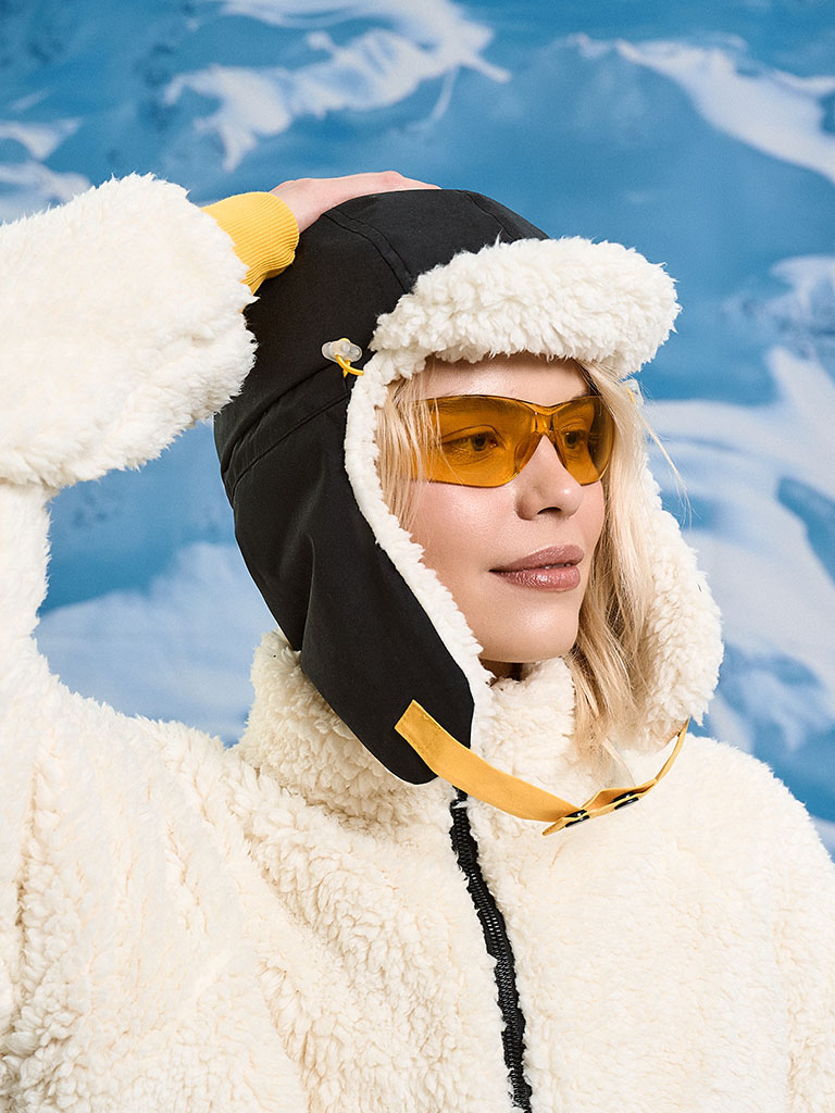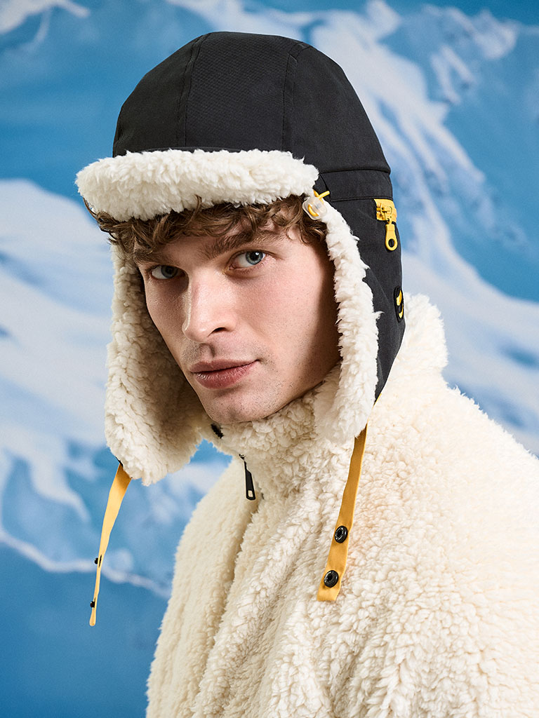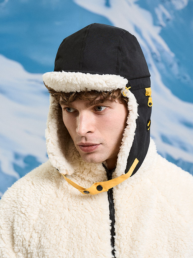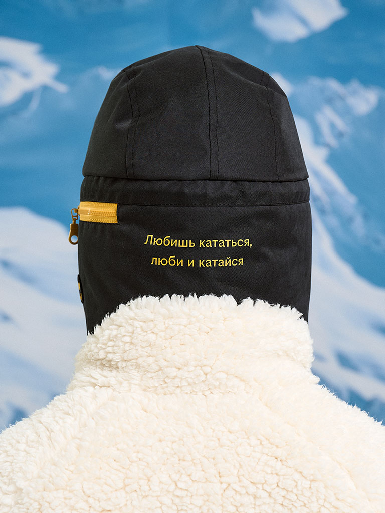 Шапка с козырьком и ушами с принтом «Любишь кататься, люби и катайся» — про движение без пауз. Козырёк, направленный вниз, срезает блики и ветер, обзор — чистый. Жёлтая кулиска с чёрными стопперами — подогнал посадку одной рукой. Хлястики снизу на кнопке: застегнул для скорости, расстегнул для чила. На одном «ухе» — карман для мелочей: карта, ключи, наличка. Лёгкий стиль, рабочий функционал — на склон и в город.