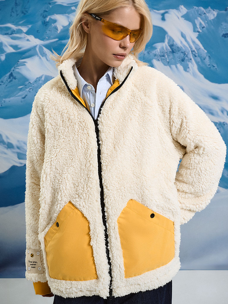 Тёплый и заметный бомбер на длинный день с драйвовым слоганом. Шерпа, непродуваемая подкладка и синтепон средней плотности держат тепло и срезают ветер. Модель выполнена в стиле оверсайз с рукавом реглан и контрастными деталями. Большие велюровые карманы на кнопках с утеплителем — удобно и надёжно.