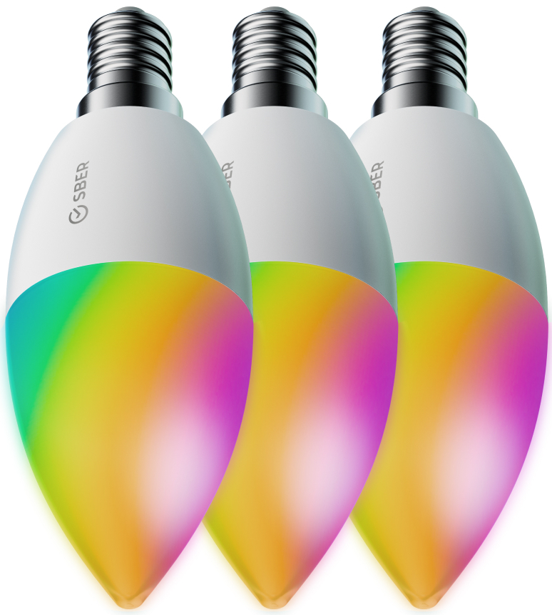 Комплект из трёх умных ламп Sber с цоколем Е14. Их хватит, чтобы заменить старые лампочки в целой комнате, и при этом вы потратите меньше: комплект стоит дешевле, чем три лампы по отдельности. Лампами можно управлять дистанционно через приложения Салют и СберБанк Онлайн, а также через устройства с ассистентом Салют: SberBoom, SberBox и другие.