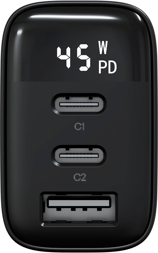 Вход: 110-240V, ~50/60Hz, 0.7A Выход USB-C1/C2: 5V/3A, 9V/3A, 12V/3A, 15V/3A, 20V/2.25A (45W Max); USB-C1/C2 PPS: 5-11V/4.5A, 5-16V/2.25A (45W Max); USB-A: 5V/3A, 9V/3A, 12V/2.25A (27W Max); USB-C1+C2: 17W; USB-C1+A: 17W; USB-C2+A: 17W; USB-C1+C2+A: 17W. Особенности: Встроенный дисплей с индикацией текущей нагрузки, три порта, поддержка PPS, PD3.0, QC4.0+, AFC, FCP, SCP, APPLE2.4A, MTK PE+, компактный корпус из огнестойкого поликарбоната.