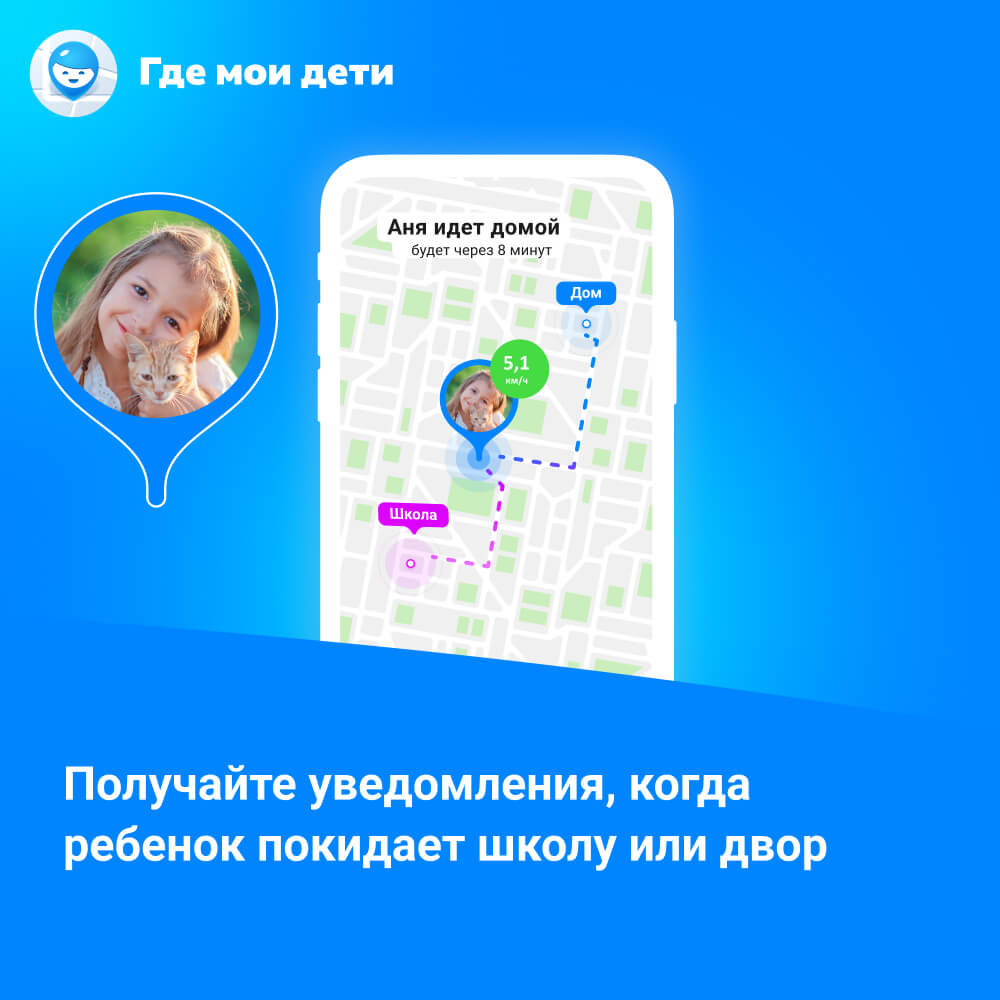 ребёнок вовремя пришёл в школу - получайте уведомления о том, когда он приходит в школу, возвращается домой и в другие места, созданные вами.