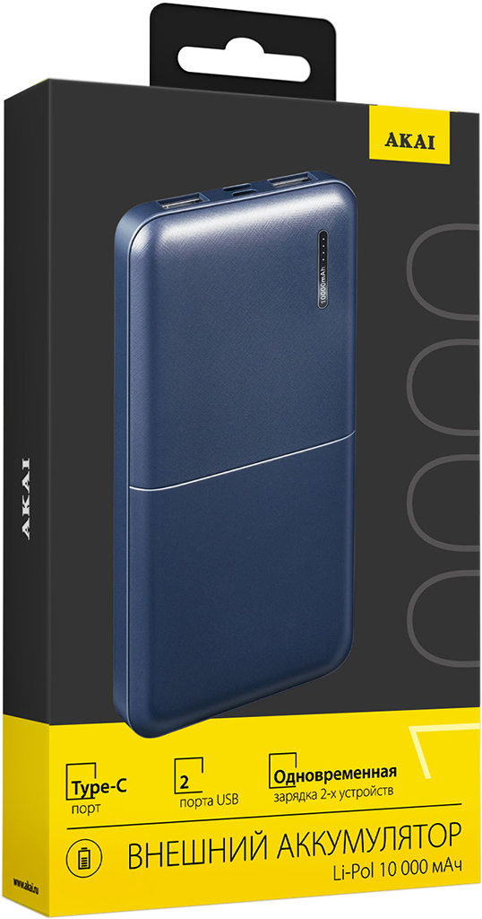 Портативное зарядное устройство AKAI емкостью 10000 mAh и мощностью 10,5 Вт — надежный источник энергии для всех видов ваших устройств. С поддержкой одновременной зарядки через два порта USB-A.